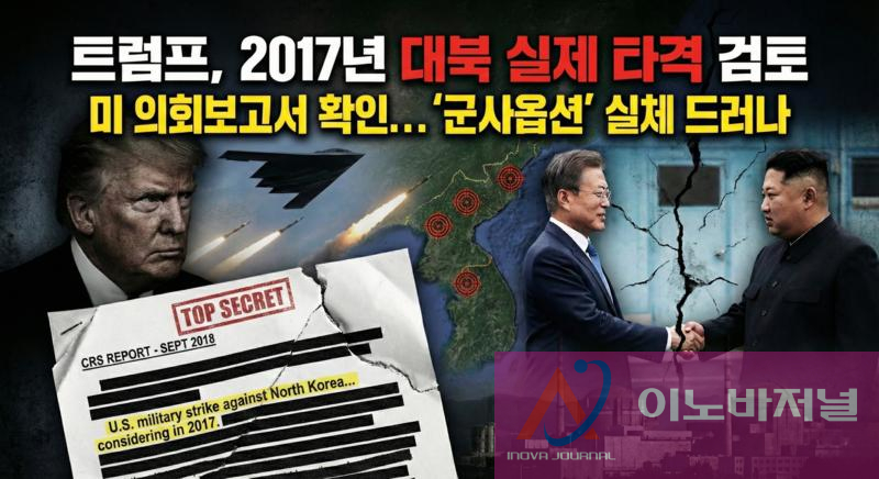 미 의회조사국(CRS)이 발행한 보고서에 따르면, 2017년 한반도 위기 당시 트럼프 행정부가 단순한 경제 제재를 넘어선 실제적인 '대북 군사 타격'을 심도 있게 검토했던 사실이 명문화된 문서로 처음 확인되어 큰 파문이 일고 있다. 2017년 당시 국내 일부 언론에서도 이와 같은 내용의 보도가 있었으나, 미 행정부 고위 관리의 말을 인용한 것이었다. 이노바저널은 미 의원회 보고된 원문을 입수하여 심층 분석하였다.