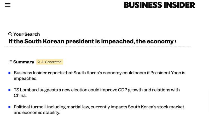 자료 캡처24' 12. 9.(https://www.businessinsider.com/answers#If%20the%20South%20Korean%20president%20is%20impeached,%20the%20economy%20will%20grow%20explosively). 민주당이 윤석열 대통령을 탄핵해야 한국 경제가 성장한다는 내용이라는 일개 외국의 잡지의 써머리 내용이다. 12월 8일 민주당은 이 잡지를 인용해, "탄핵이 경제"라는 성명서를 발표하였다.