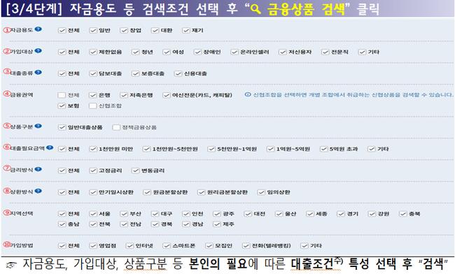 이 서비스는 대출 금리, 상환방식, 가입 대상 등 조건을 검색하고, 결과를 정렬 및 세부 정보를 확인할 수 있는 맞춤형 기능을 제공한다. 검색 조건은 자금용도, 가입대상, 대출 종류 등 10개 항목으로 세분화되어 사용자가 자신의 상황에 맞는 상품을 쉽게 탐색할 수 있다.