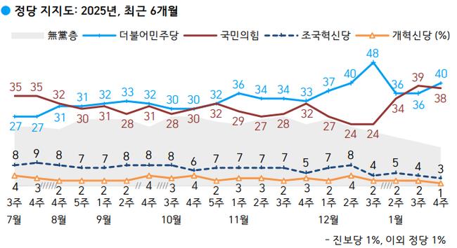 한국갤럽이 2025년 1월 21일부터 23일까지 실시한 여론조사 결과, 정당 지지도는 더불어민주당 40%, 국민의힘 38%로 양당이 치열한 경쟁 구도를 형성했다.