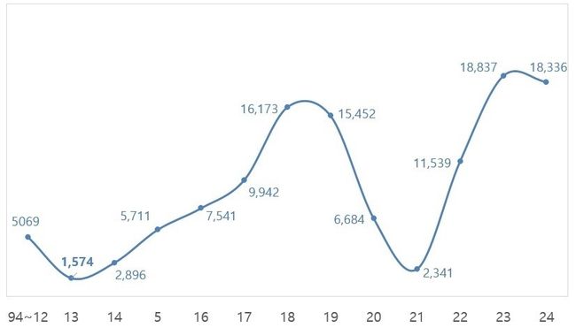 1994년부터 2012년까지 약 18년간 난민신청은 5,069건에 불과했으나, 2013년 1,574건에서 2023년 18,837건(역대 최대)으로 증가하며 약 12배 급증했다. 2024년 12월까지의 누적 신청 건수는 122,095건이다.