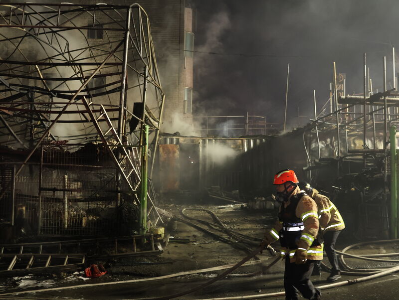 ↳소방 활동에 여념이 없는 천안시 소방대원들(사진=최득진 주필). 화재 현장은 모두 불에 타 철골만 남은 상태였다.