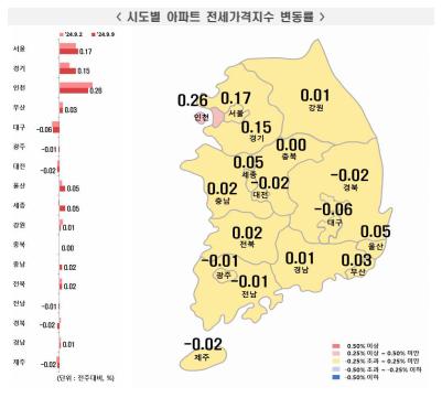 반면, 대구(-0.06%)와 제주(-0.02%) 등 지방 주요 도시에서는 전세가격이 하락했다. 지방 전체로는 보합세(0.00%)를 기록했으나, 울산(0.05%)과 세종(0.05%)은 소폭 상승했다.