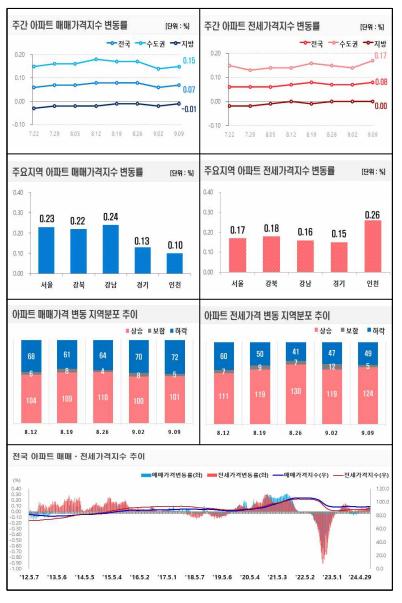 2024년 9월 2주차 전국 아파트 매매가격과 전세가격이 꾸준한 상승세를 보이고 있다. 한국부동산원에서 발표한 자료에 따르면, 전국 주간 아파트 매매가격은 전주 대비 0.07% 상승했으며, 전세가격은 0.08% 증가했다. 수도권의 가격 상승폭은 더욱 두드러졌으며, 서울과 경기 지역은 매매 및 전세가격 모두 상승세를 기록했다.