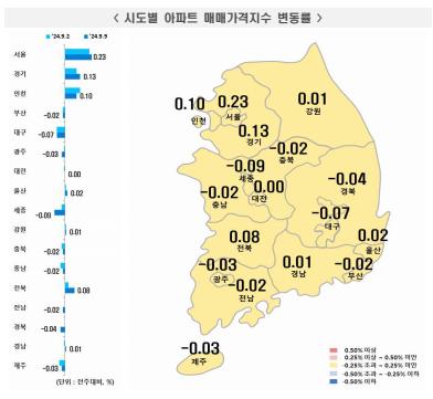 지방 아파트 매매가격은 -0.01%로 하락세를 이어갔다. 5대 광역시 중에서는 대구(-0.07%)와 광주(-0.03%)가 하락세를 기록했으며, 세종(-0.09%) 역시 하락세가 두드러졌다. 반면 전북(0.08%)은 소폭 상승했다. 전주 완산구(0.34%)와 남원시(0.15%)가 상승을 이끈 반면, 경북 지역은 영천시(0.19%)를 제외한 대부분의 지역이 하락세를 보였다.