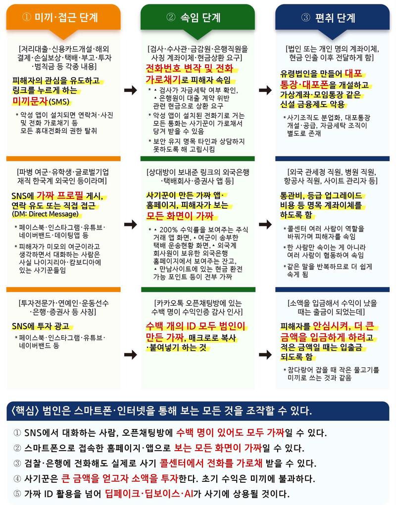 사기의 대표적인 유형으로는 투자리딩방, 보이스피싱, 메신저피싱, 스미싱, 연애빙자사기 등이 있다. 사기범들은 스마트폰과 인터넷을 이용해 정교하게 제작된 가짜 앱과 홈페이지로 피해자들을 속이며, 실제 금융기관이나 공공기관을 사칭하는 등 고도화된 수법을 사용한다.