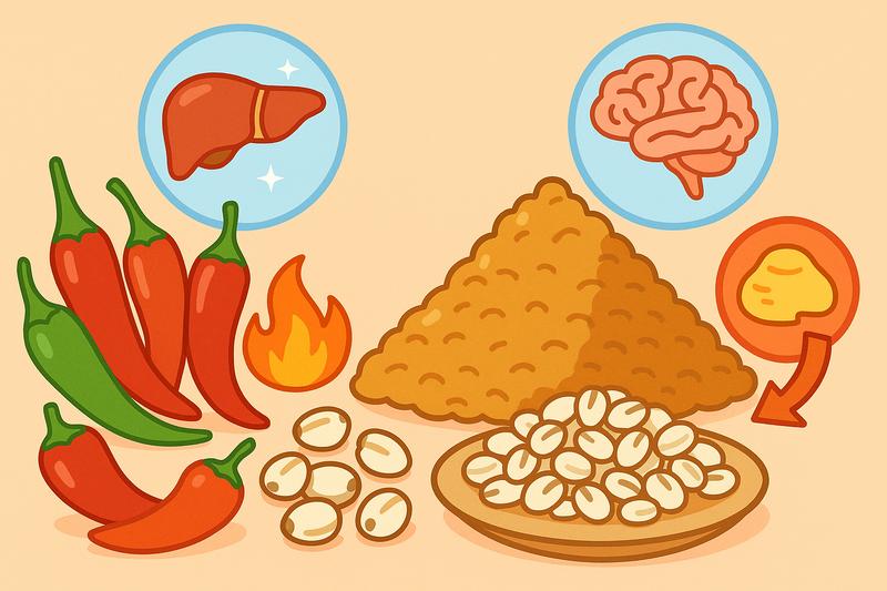 고추에서는 매운맛을 내는 캡사이신과 디하이드로캡사이신이 주요 알칼로이드로, 지방산 산화를 촉진해 체지방 분해에 도움을 줄 뿐 아니라, 알츠하이머병이나 파킨슨병 등 퇴행성 뇌질환에서도 신경 보호 효과가 있는 것으로 보고되었다. 특히 꽈리고추에는 디하이드로캡사이신 함량이 가장 높게 나타났으며, 위장 자극이 적고 체내 흡수율이 높다는 장점이 있다.
