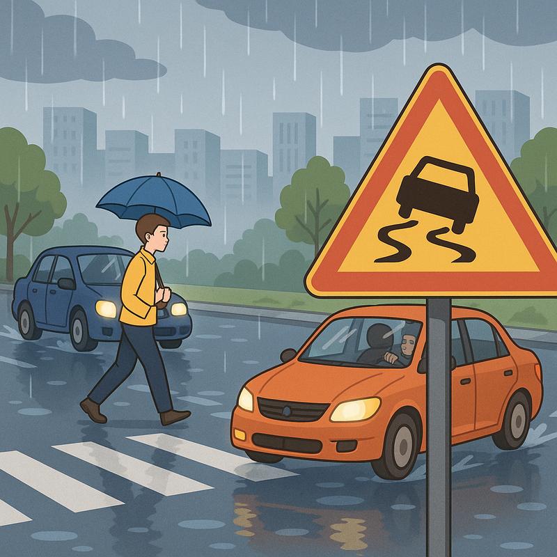 비가 오는 날에는 도로가 젖어 있어 수막현상이 발생하기 쉽고, 차량 제동거리도 길어지므로 평소보다 감속 운전이 필요하다. 공단은 도로가 젖은 경우 제한속도의 20%, 가시거리가 100m 이내인 폭우 시에는 50%를 감속할 것을 권고했다.
