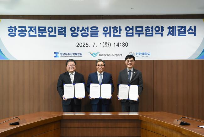 인천국제공항공사(사장 이학재)는 지난 1일 공사 회의실에서 인하대학교(총장 조명우), 항공우주산학융합원(원장 유창경)과 `항공전문인력 양성을 위한 양해각서(MOU)`를 체결했다고 2일 밝혔다.