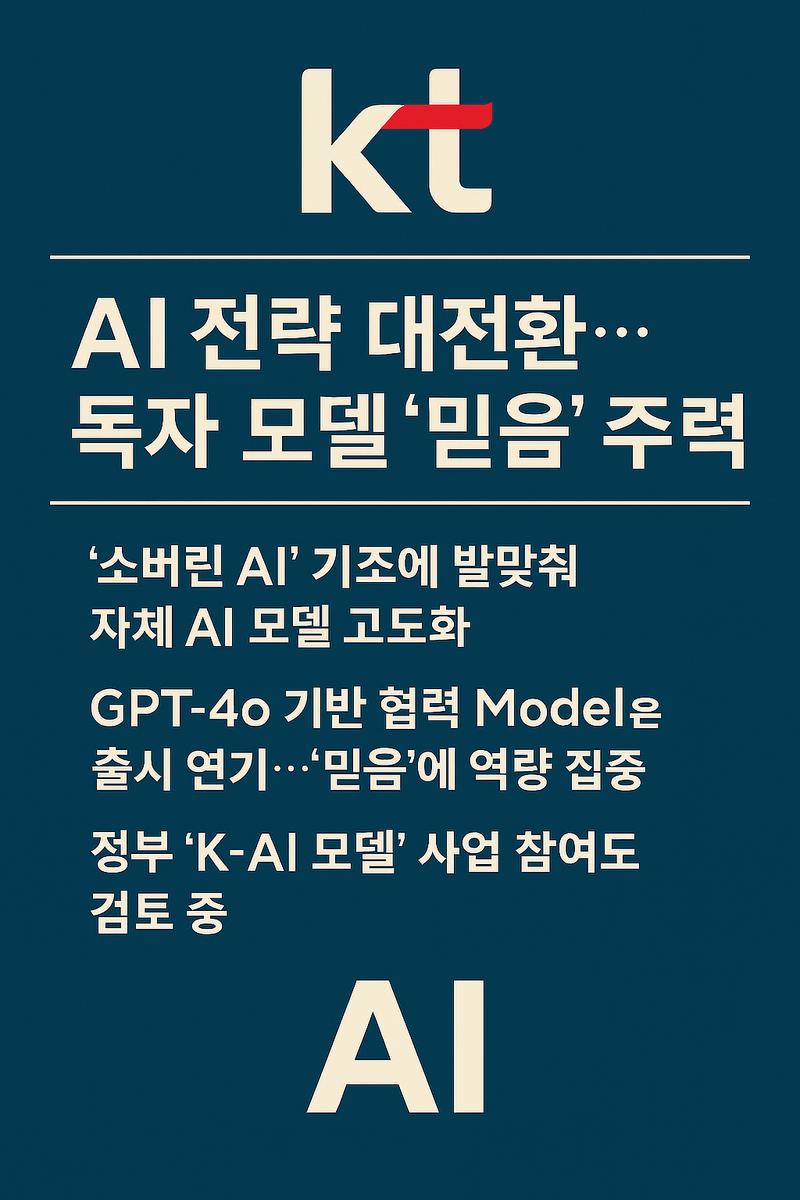 7월 2일 연합뉴스 보도에 따르면, KT가 인공지능(AI) 및 클라우드 사업 전략의 중심축을 마이크로소프트(MS)와의 협력에서 자체 개발 AI 모델 ‘믿음(Mi:dm)’으로 전환하고 있다. 이는 이재명 정부가 강조하는 ‘소버린 AI’(Sovereign AI) 기조에 발맞춘 행보로, KT는 독자적인 기술력 확보와 AI 생태계 주도권 강화를 목표로 전략을 수정한 것으로 분석된다.