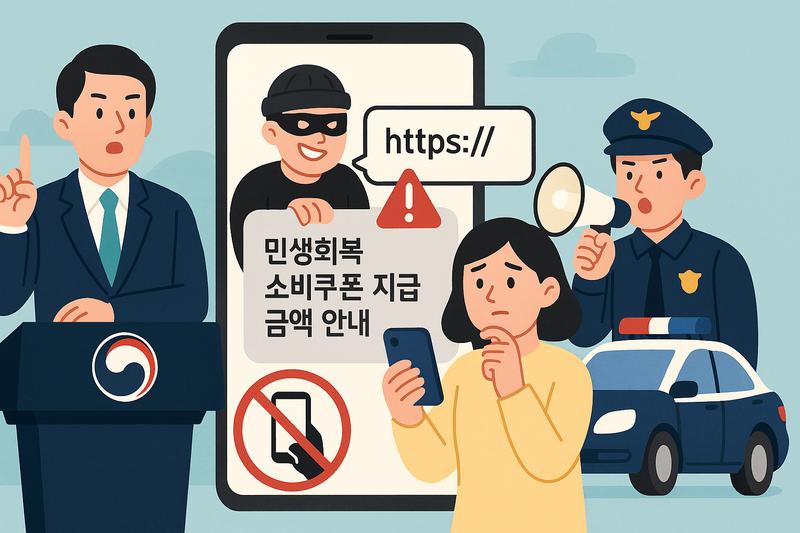 정부는 오는 7월 14일부터 본격적으로 진행되는 ‘민생회복 소비쿠폰’ 신청·지급을 앞두고 정부나 카드사·은행 등을 사칭한 결제사기 문자(스미싱)가 늘어날 것으로 예상된다며 국민들에게 각별한 주의를 요청했다.