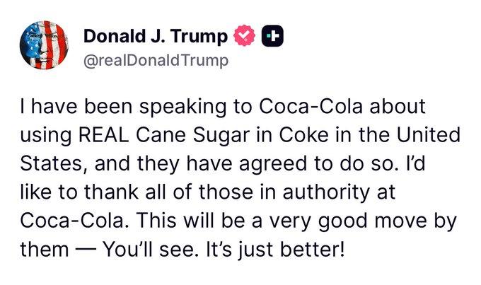트럼프의 게시물은 수백만 뷰를 빠르게 모았으며, 내용은 다음과 같다: "나는 코카콜라와 미국에서 코크에 진짜 사탕수수 설탕을 사용하는 것에 대해 이야기해 왔고, 그들은 그렇게 하기로 합의했다. 코카콜라의 모든 권위자들에게 감사드린다. 이는 그들에게 매우 좋은 움직임이 될 것이다 — 당신이 보게 될 것이다. 그냥 더 나아!" 다이어트 코크 애호가로 알려진 트럼프 대통령은 HFCS에 대한 비판자이기도 하며, 사탕수수 설탕이 우수한 맛을 제공한다고 강조하며 이 가정된 변화를 미국 소비자들의 승리로 위치지었다.