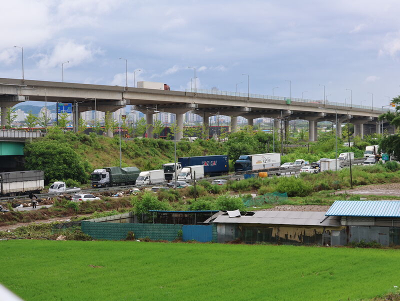 ♦ 충남 천안시와 아산시 경계의 곡교천대교 부근에서 일부 침수되어 차량이 멈춰서 있다. (사진=최재영 기자)