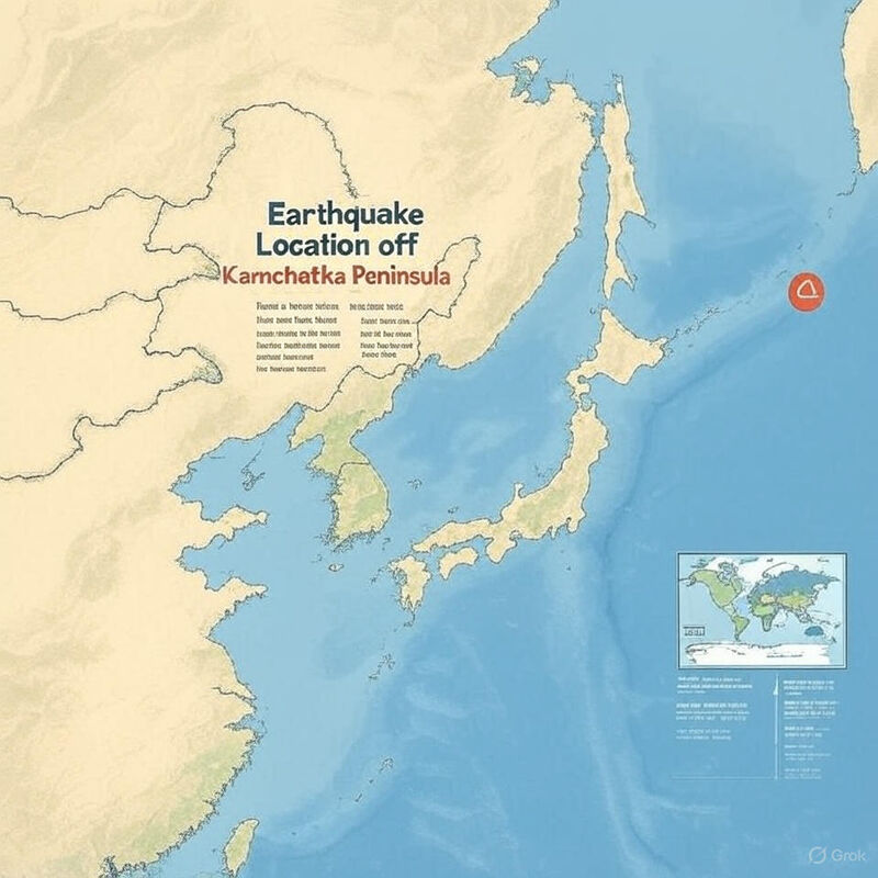 인포그래릭의 붉은 원은 지진이 발생한 지역을 표시한 것이다. 인포그래픽은 기사 내용을 기반으로 Grok4 AI를 활용 인포그래픽 디자인 한 것이다.페트로파블로프스크-캄차츠키, 2025년 7월 21일 (로이터 통신 보도) – 러시아 캄차카 반도 동쪽 해역에서 규모 7.4의 강진이 발생해 일시적으로 쓰나미 경고가 발령됐으나, 이후 해제됐다. 이 지진은 깊이 10~20km에서 발생한 역단층 지진으로, 여러 차례 여진이 이어졌으나 즉각적인 대규모 피해는 보고되지 않았다.