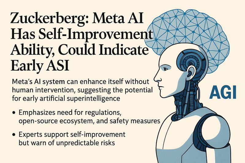 인포그래픽=이노바저널 AI 이미지 디자인마크 저커버그(Mark Zuckerberg) 메타 CEO가 자사 인공지능(AI) 연구 성과를 공개하며 Meta AI가 스스로 개선하는 능력을 확보했다고 밝혔다. 이는 초기 단계의 초지능(Artificial Superintelligence, ASI) 가능성을 시사하는 발언으로, 업계와 학계에 큰 반향을 불러일으키고 있다.