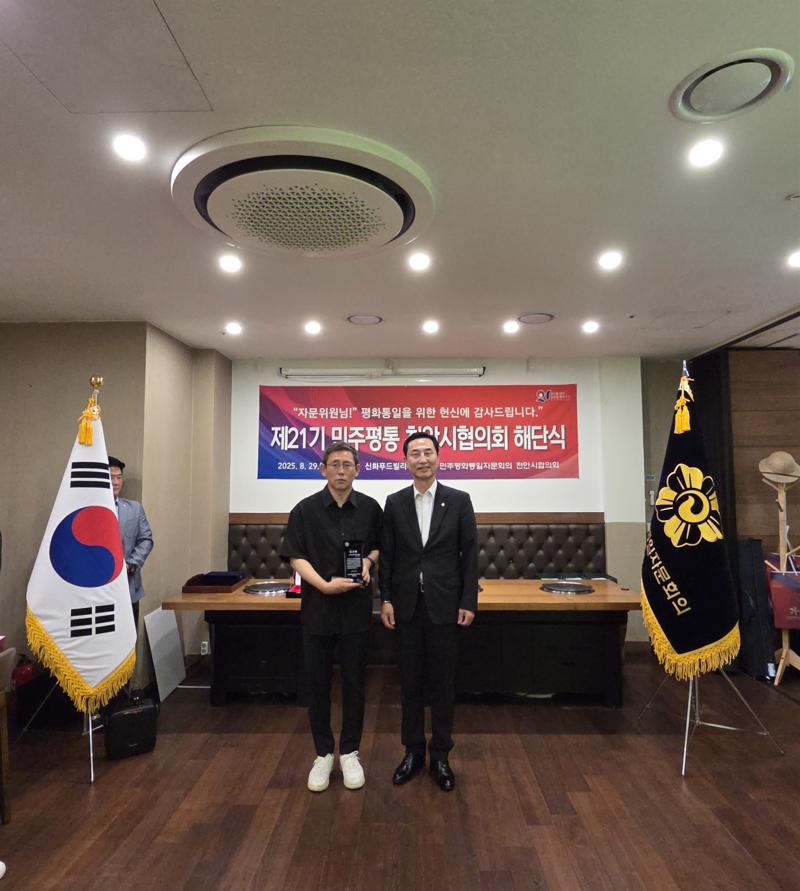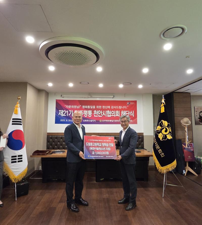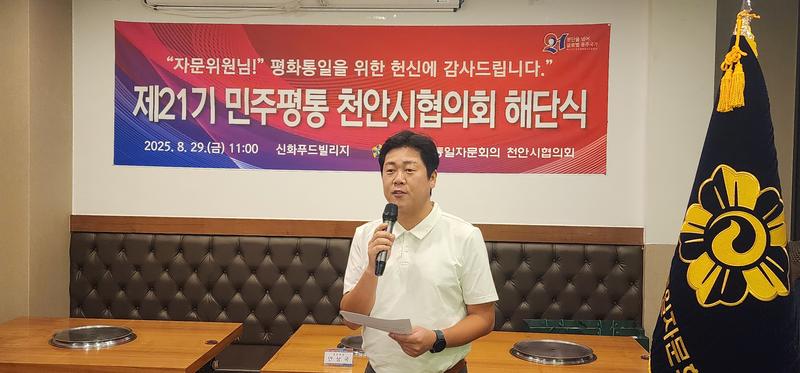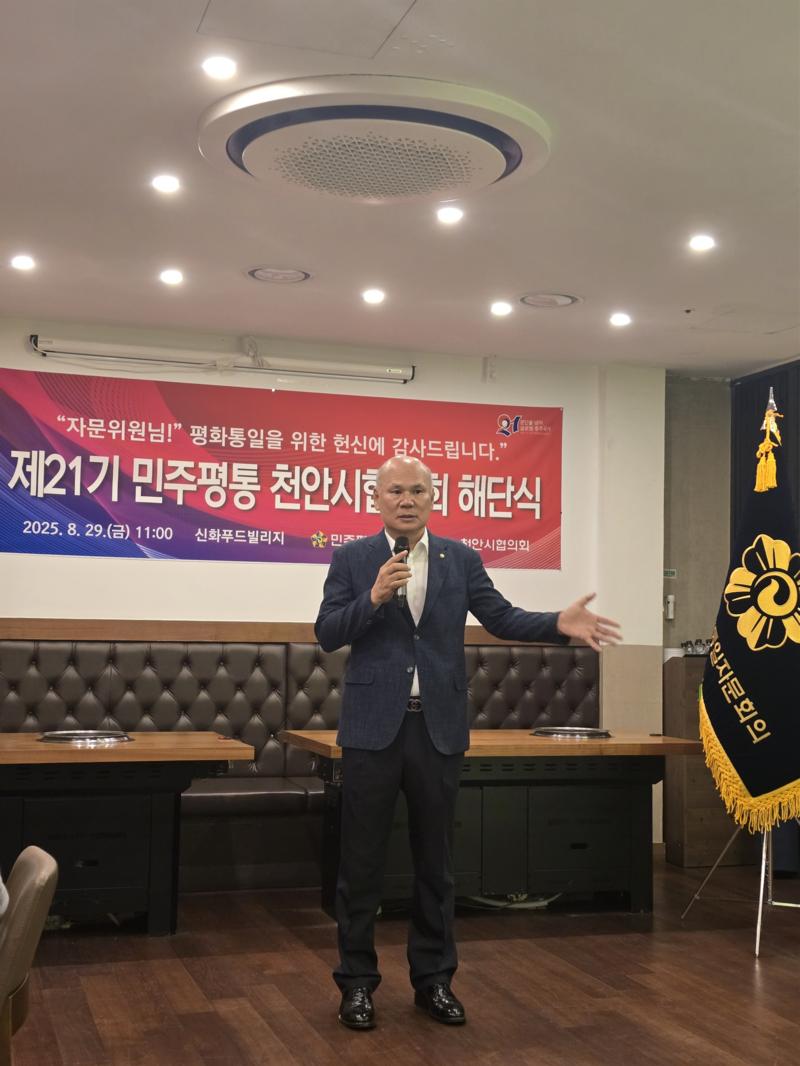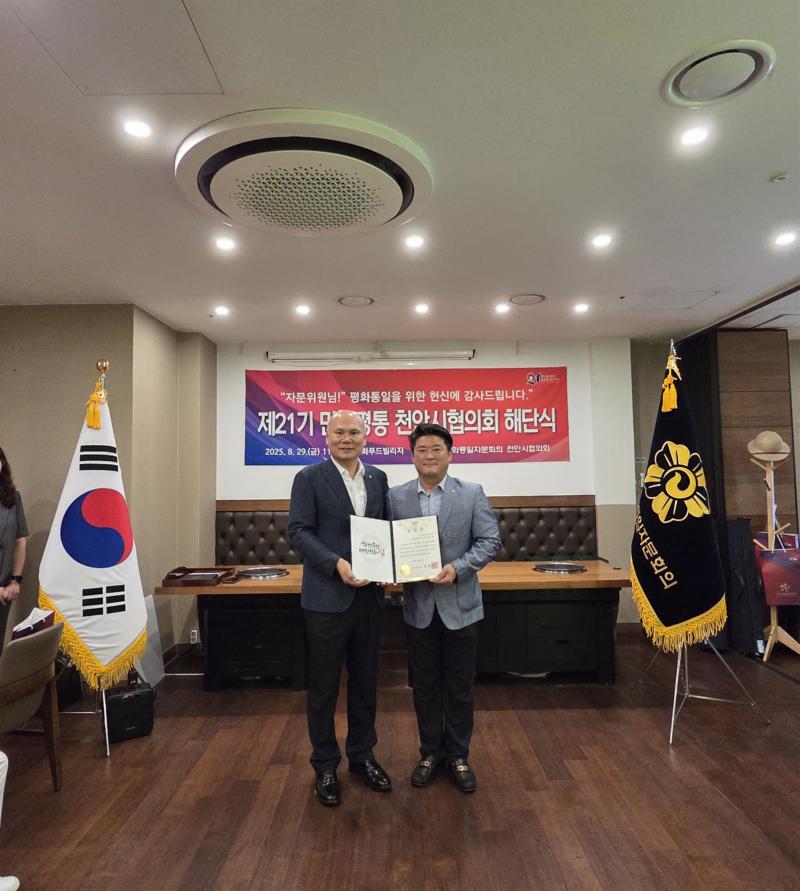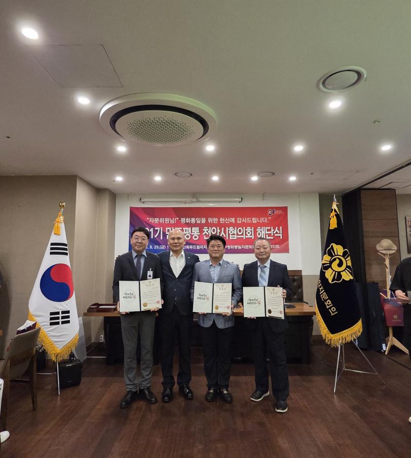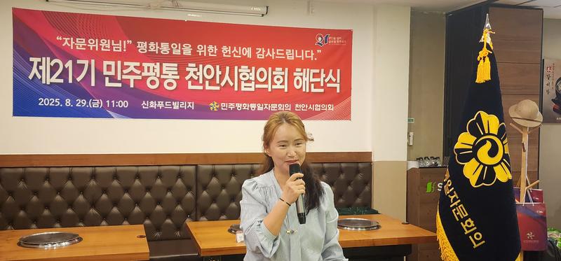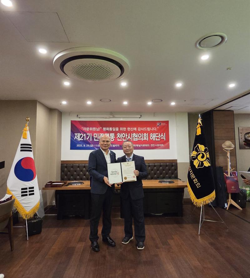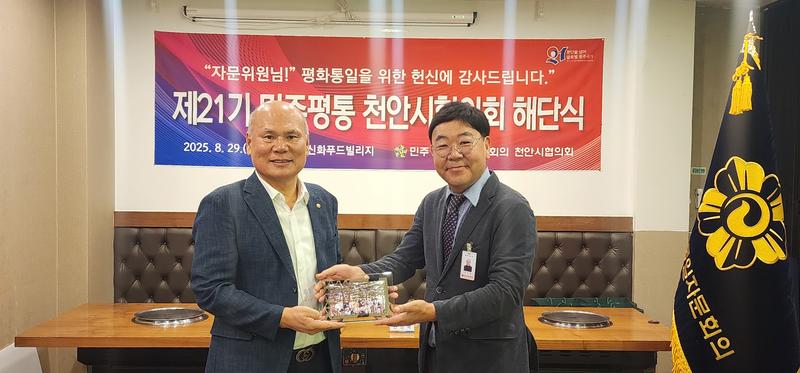 민주평화통일자문회의 천안시협의회가 8월 29일(금) 신화푸드빌리지에서 제21기 해단식을 열고 2023년 9월부터 2025년 8월까지의 활동을 정리했다. 행사에서는 유공 자문위원 표창, 북한이탈청소년 장학금 전달, 활동보고 등이 이어졌다.