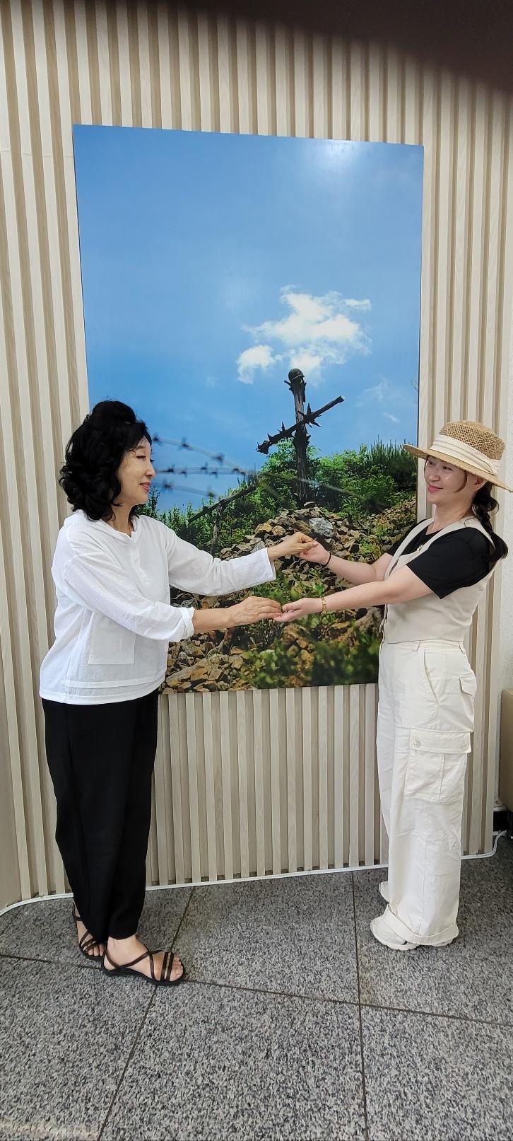 ![]() 임재길 자문위원이 2년 동안의 활동 소감을 발표하고 있다. | ![]() 문이정 멘티가 김기숙 멘토에게 감사의 마음을 담은 편지를 읽고 전달하며, 민주평통에 대한 소감을 밝히고 있다. | ![]() 김기숙 자문위원 멘토와 문이정 멘티의 아름다운 모습. '비목'을 배경으로 한 이 사진을 문이정 멘티는 예쁜 크리스탈 액자에 넣어 김기숙 자문위원 멘토에게 깜짝 선물을 하여 모두를 훈훈하게 하였다. |