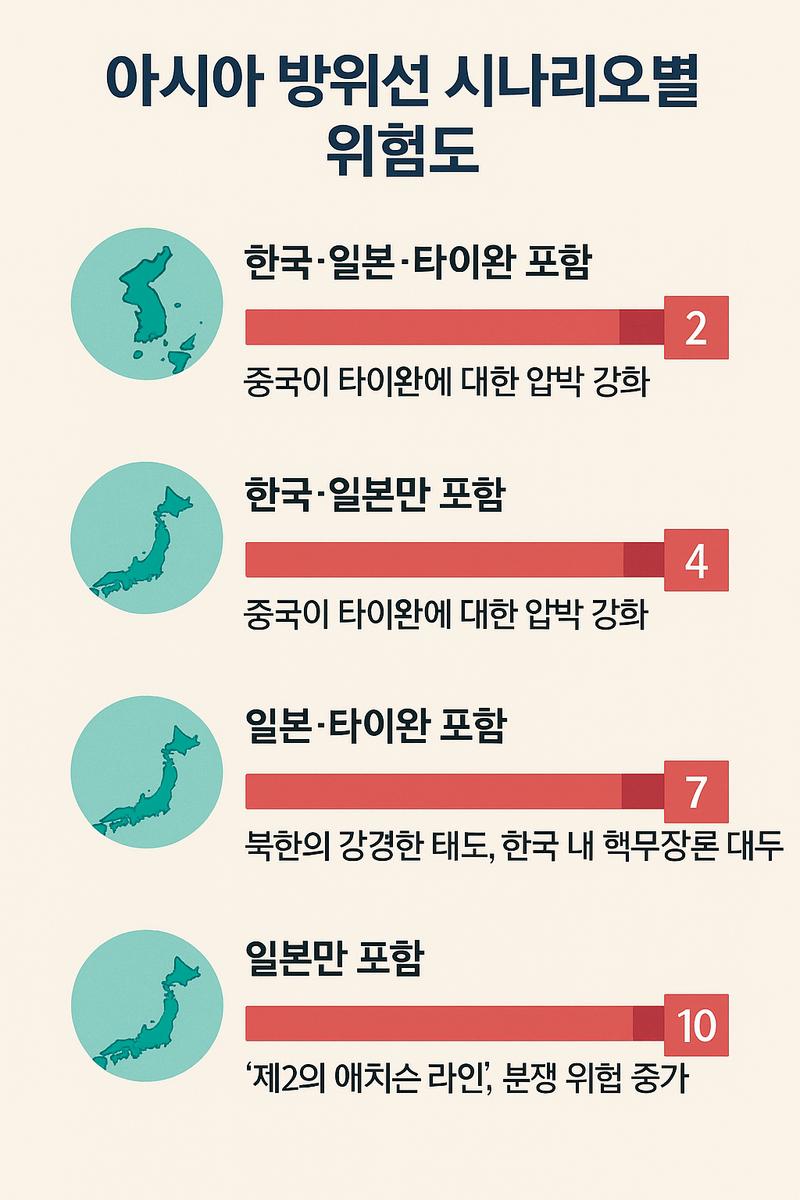 자료=기사 내용을 기반으로 최고 위험도를 10으로 설정,아시아 방위선 시나리오별 위험도를 시각화한 것이다(국제외교안보 전문가 최득진 박사 제공).