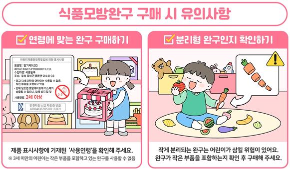 식품과 비슷한 모양으로 제작된 완구는 어린이가 식품으로 착각하거나 작은 부품을 삼키는 사고로 이어질 수 있어 주의가 필요하다. 소비자원과 국표원은 식품모방완구를 구매할 때 반드시 KC 인증 마크와 사용 연령을 확인할 것을 권고했다. 특히, 작은 부품이 포함된 완구는 3세 미만 어린이에게 치명적인 위험이 될 수 있어 보호자의 지도가 필수적이다.