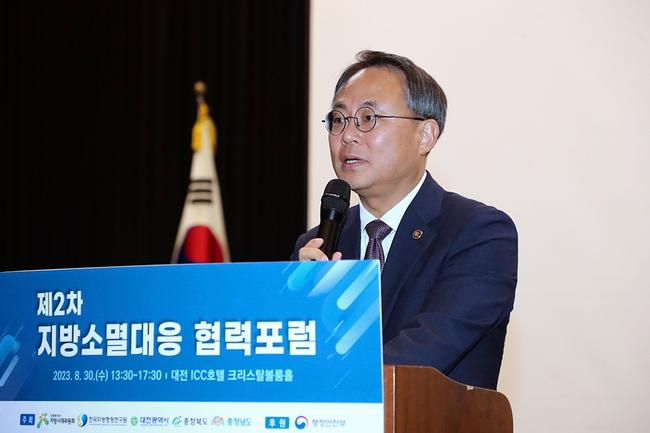 고기동 행정안전부 차관이 지난 해 8월 30일 오후 대전시 유성구 호텔 ICC 1층 그랜드볼룸에서 열린 `제2차 지방소멸대응 협력포럼`에 참석해 축사를 하고 있다.
