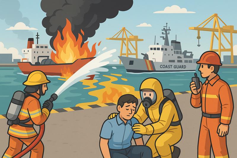 이번 시나리오는 톨루엔을 실은 화물선이 부두 인근 LNG 시설과 충돌하면서 폭발과 화재가 발생하고, 다량의 유해화학물질이 누출되는 상황을 가정했다. 이에 따라 관계기관은 초기 인명 구조, 화학물질 확산 방지, 주민 대피 등 단계별 대응 절차를 점검했다.
