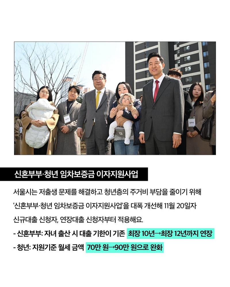 서울시(시장 오세훈)는 저출생 문제 해결과 청년층의 주거비 부담 완화를 위해 ‘신혼부부·청년 임차보증금 이자지원사업’을 대폭 확대한다고 7일 밝혔다. 이번 개편안은 **오는 11월 20일(목)**부터 신규 대출 신청자와 대출 연장 신청자에게 순차적으로 적용된다.