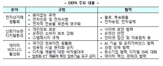한국은 디지털 통상 협력 강화의 필요성을 인식하여, 2021년 DEPA 가입 절차를 시작해 올해 5월 가입을 완료했다. 이번 가입으로 전자무역 활성화와 데이터 비즈니스 환경 조성에 박차를 가해 디지털 콘텐츠와 서비스의 해외 진출을 확대하고, 중소기업의 디지털 경쟁력 강화를 도모할 계획이다. DEPA를 통해 정부 간 협력과 디지털 중소기업 대화를 활성화해 기술 협력 기반도 마련할 방침이다.
