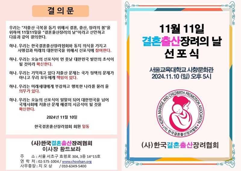 오는 11월 10일(일), 한국결혼출산장려협회가 주관하는 "결혼·출산·장려의 날" 선포식이 서울교육대학교 사향문화관에서 열린다.