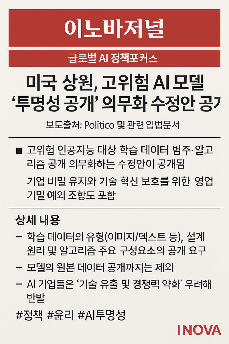 인포그래픽=이노바저널 AI 생성♦ 미국 상원에서 고위험 인공지능 모델에 대해 학습데이터 범주 및 알고리즘 공개를 의무화하는 수정안이 공개됐다. 기업 비밀 유지와 기술 혁신 보호를 위한 영업기밀 예외 조항도 포함돼 있으며, 향후 입법 논의의 핵심 축으로 떠올랐다.