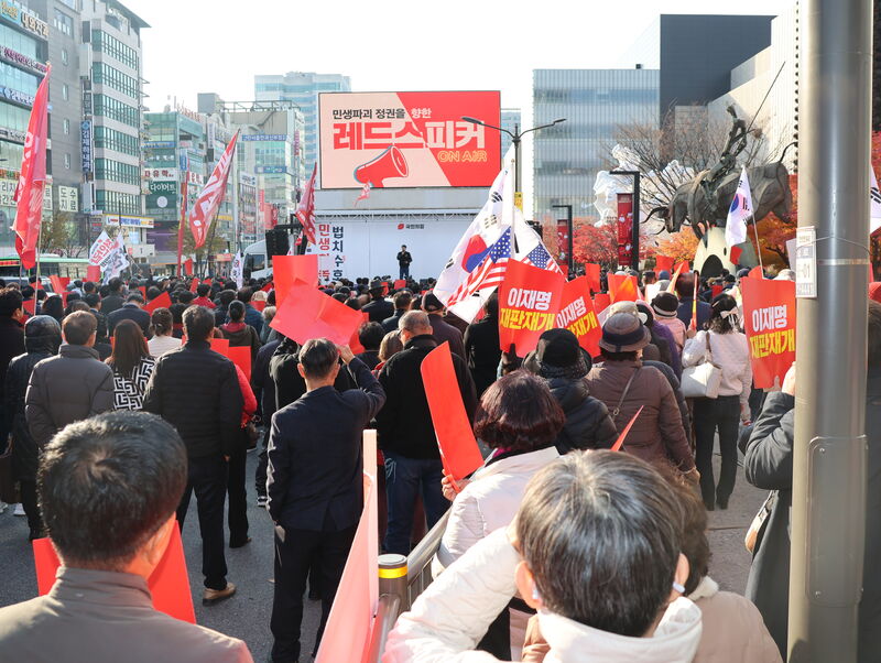 (천안 - 정치부) 2025년 11월 26일, 충청남도 천안시외버스터미널 앞에서 국민의힘 주최 '민생회복과 법치수호 충남 국민대회'가 열렸다. 전국 순회 중 다섯 번째로 열린 이번 행사는 당 지도부와 수천 명의 당원, 지지자들이 모인 가운데 현 정부의 민생 실정과 법치 훼손을 강하게 비판하는 자리로 마련됐다. 참석자들은 "이재명 정권 퇴진"과 "민생 레드카드" 구호를 외치며 정부 정책의 전환을 촉구했다.