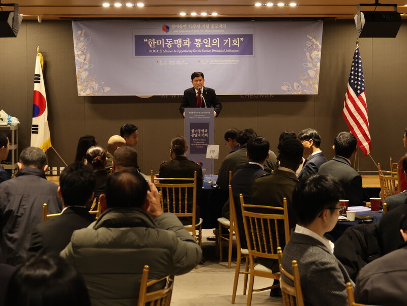 이날 심포지엄의 핵심 의제는 "한미동맹과 통일의 기회"였다. 하이라이트는 유원대학교 박성기 교수의 주제 발표였다. 박 교수는 강단에 서서, 72년을 이어온 양국 간의 신뢰가 단순히 전쟁 억지력을 넘어 한반도 통일의 결정적 기회를 제공하는 토대임을 역설했다.