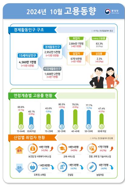 이번 10월 고용동향은 청년층의 취업 기회 축소와 특정 산업에서의 고용 감소가 주요 문제로 지적된다. 동시에 보건, 교육, 전문 과학 분야의 고용 증가는 사회 서비스 분야의 수요 증가를 반영하는 것으로 보인다.[출처: 통계청 보도자료]