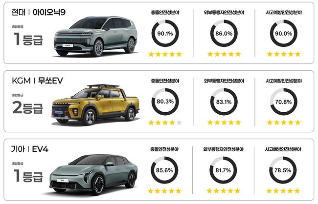 국토교통부와 한국교통안전공단 자동차안전연구원은 2025년 자동차안전도평가(KNCAP) 종합평가 결과, 현대 아이오닉9·팰리세이드·넥쏘와 기아 EV4가 충돌·보행자·사고예방 안전성에서 모두 높은 점수를 받아 1등급을 획득했다고 17일 밝혔다.