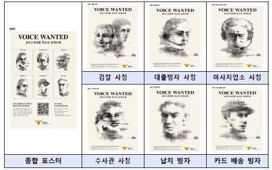 경찰청은 최근 신고가 집중된 보이스피싱 범죄 유형 6가지를 선정해, 범인의 실제 음성에서 추출한 파형 데이터를 활용한 ‘가상 수배 전단 포스터’를 제작했다. 검찰 사칭, 대출 빙자, 수사관 사칭, 납치 빙자, 카드 배송 빙자, 마사지업소 사칭 등 대표적 수법이 대상이다. 파형을 시각화한 라인드로잉 기법을 적용해 ‘목소리 몽타주’ 형태로 구현한 것이 특징이다.