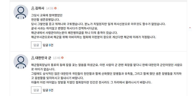시민들의 반응도 이어지고 있다. 한 시민은 댓글에서 “해군협회장이 동료의 등에 칼을 꽂는 발언을 했다니 믿기 어렵다”며 “이런 사람이 군 관련 단체의 회장을 맡는다는 것 자체가 대한민국 군인으로서 이해할 수 없는 일”이라고 비판했다. 또 “천안함과 함께 산화한 장병들과 유족, 그리고 생존 장병들을 지지하고 응원하는 국민이 많다는 사실을 잊지 말아달라”고 덧붙였다.