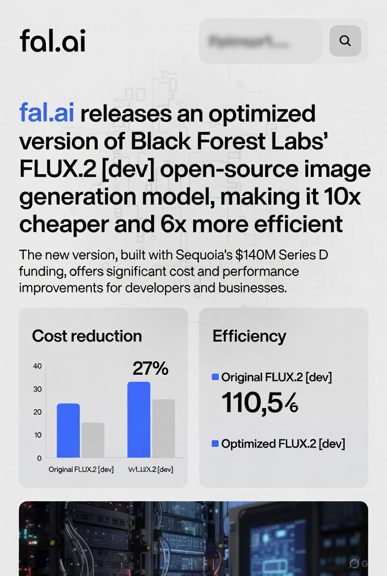AI 생성 미디어 플랫폼 fal.ai가 최근 Black Forest Labs의 오픈소스 이미지 생성 모델 FLUX.2 [dev]의 최적화 버전인 FLUX.2 [dev] Turbo를 출시했다. 이 모델은 기존 모델 대비 10배 저렴하고 6배 더 효율적이며, 고품질 이미지를 더 빠르게 생성할 수 있어 개발자와 기업의 주목을 받고 있다.