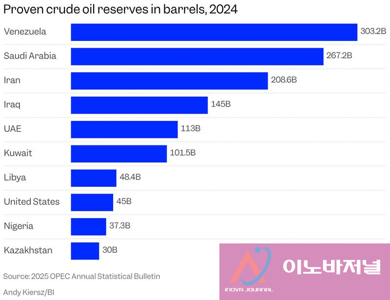 ♦ 베네수엘라 증명 매장량 약 3,030억 배럴 – 세계 1위, 출처: 다양한 차트 비교