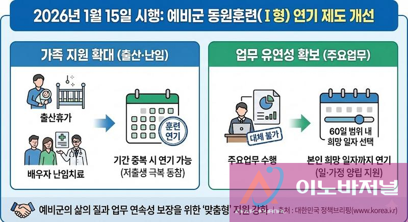 대한민국 국방부가 변화하는 사회적 가치와 장병들의 현실적인 여건을 반영하여 예비군 동원훈련(Ⅰ형) 연기 규정을 대폭 완화한다. 오는 1월 15일부터 시행되는 이번 조치는 '일과 가정의 양립'을 지원하는 데 초점을 맞추고 있다.