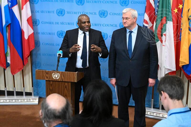 데이비드 램미(왼쪽), 영국 외교부 장관이자 11월 안보리 의장이 기자들에게 우크라이나의 평화와 안보 유지에 관한 안보리 회의에 앞서 브리핑을 하고 있다. 오른쪽은 우크라이나 외무부 장관인 안드리 시비하이다.(사진 UN 안보리 제공)